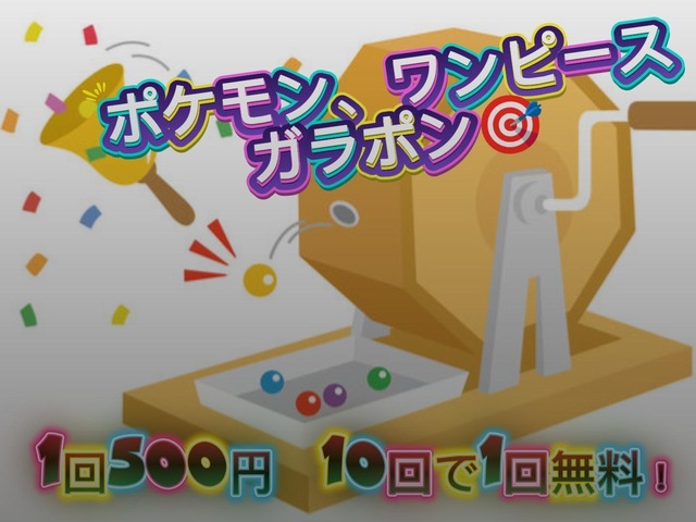 ガラポンでゲット!ポケモンカードチャレンジ! 全350口・1回550円 10回で1回無料! 楽しいガラポンで、ポケモンカードのワクワク感を体験しよう! 【遊び方】 注文が入りましたらガラポンアプリで抽選を行います。出た色ごとに景品がランダムで決まります。色ごとの景品は下記の通りです。一玉に対しての景品は一つです。 引くたびにドキドキが止まらない、豪華ラインナップを取り揃えています! ―――――――――― 【金賞】1個 ・メガドリーム新品BOX ・テラスタルフェス新品BOX ・ナンジャモSAR 【銀賞】1個 ・ムニキスゼロBOX ・メガドリームシュリンクなしBOX 【紫】5個 ・SAR 【青】5個 ・5パック 【緑】10個 ・3パック 【黄】20個 ・ SR 【赤】40個 ・AR 【白】 ・100円オリパ ―――――――――― 【注意事項】 ・商品内容はランダムです ・カードの状態はプレイ用としてご利用ください ・画像はイメージです ――――――――――